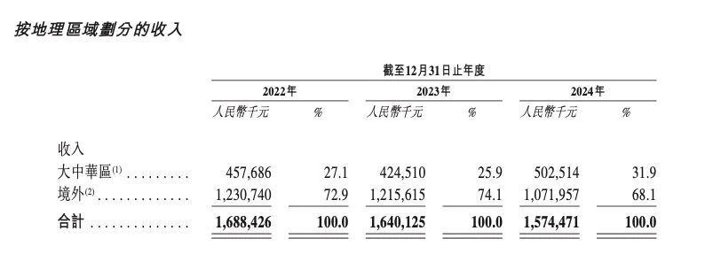 2023年至2024年,公司来自大中华区的收入分别为4.25亿元和5.03亿元,占比从2023年25.9%上升至31.9%,境外收入则为12.16亿和10.72亿元,从74.1%下滑至68.1%。