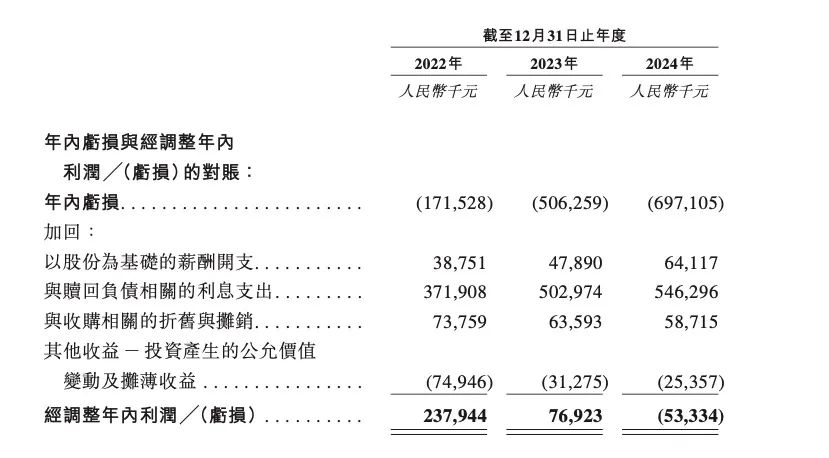 虽然,考虑到公司在之前的融资中授予部分投资者赎回权利,导致产生了大量与赎回负债相关的利息支出,将这些因素剔除后,公司报告期内经调整后的净利润分别为2.379亿元、7690万元、-5330万元。