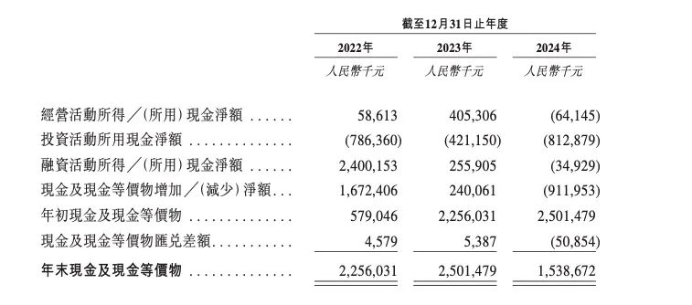 另据招股书显示,公司现金及现金等价物从2022年的22.56亿元降至2024年的15.38亿元,三年间累计减少超过7亿元。