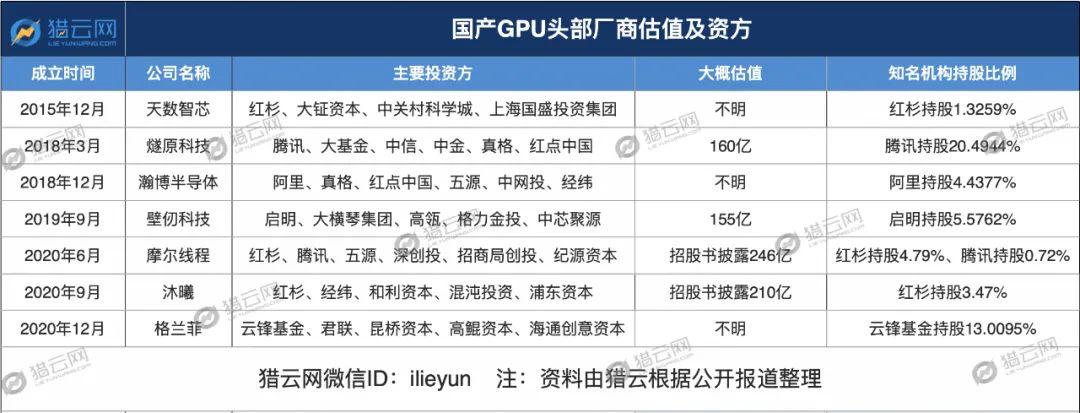 2020年,我国GPU进入创业高峰期,当前奔赴二级市场的7家公司中,就有摩尔线程、沐曦、格兰菲均成立于这一年。