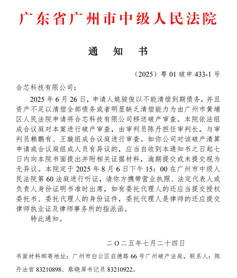 8月6日,广州中级人民法院对曾经的国产服务器CPU明星企业合芯科技破产审查进行听证。因为在此一个多月前,合芯科技一位债权人以不能清偿到期债务,并且资产不足以清偿全部债务或者明显缺乏清偿能力为由,申请将合芯科技移送破产审查。