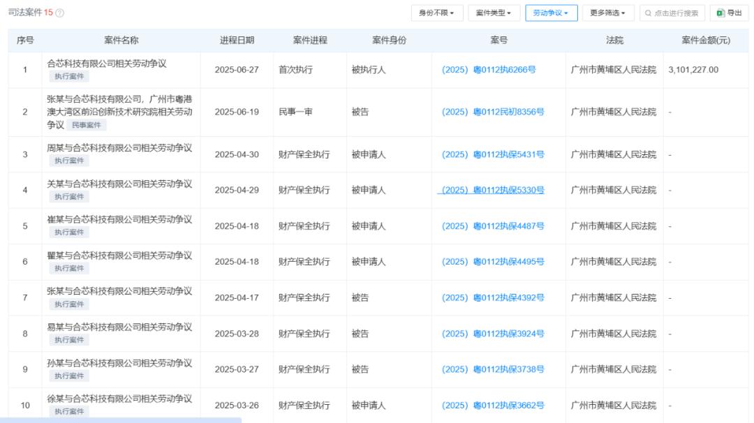 如今天眼查信息上,自今年2月起,合芯科技有15起劳动争议案件,多数案程进入财产保全执行阶段。