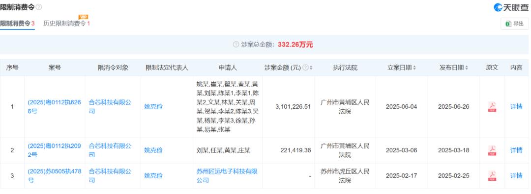而天眼查信息显示,近期,合芯科技也已经被广州市黄埔区市场监督管理局列入经营异常,原因为“通过登记的住所或者经营场所无法联系”。据天眼查信息,合芯科技被执行总金额为2131万元,法人姚克俭三次被限消,涉案金额332万元。