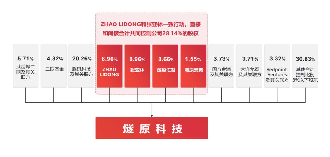 在股权机构上,赵立冬直接持有燧原科技8.9643%的股份,张亚林直接持有8.9643%的股份,二人共同担任普通合伙人和执行事务合伙人的员工持股平台燧原汇智、燧原崇英合计持有公司 10.2070%的股份,两人直接和间接合计控制公司 28.1357%的股份,二人为公司共同实际控制人。