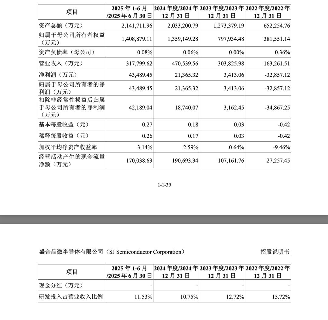 招股书显示,2022-2025年,盛合晶微的营业收入分别约16.33亿、30.38亿、47.05亿、65.21亿元;净利润和归母净利润分别约-3.29亿、3413.06万、2.14亿、9.23亿元,实现从亏损到持续盈利的跨越;扣非归母净利润分别约-3.49亿、3162.45万、1.87亿、8.59亿元。