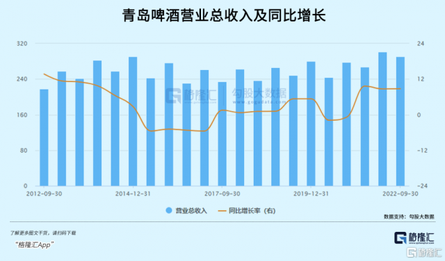 比如A股白酒最大龙头的青岛啤酒,近年10年来的营收增速几乎从未超过10%,中间还有几次增速低于0。今年前三季度,青岛啤酒营收291.1亿元,同比仅增长8.73%。