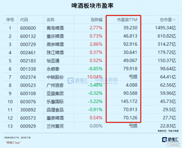 然而虽然如此,啤酒股的整体估值却明显要持续高于白酒,最新数据对比,龙一的青岛啤酒动态PE近40倍,高于茅台的37倍;龙二的重庆啤酒PE46倍,高于五粮液的27倍;龙三的燕京啤酒PE93倍,高于汾酒的46倍。