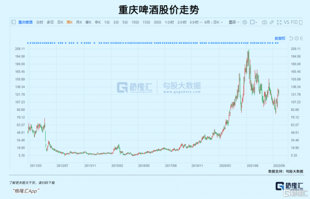 而期间,因为嘉士伯的入主,重庆啤酒近十年来一直被市场追捧,成为十年大涨几十倍的大牛股,而同时因为嘉士伯品牌的加持,重庆啤酒的PE一直享受到了远比多数同行要高的估值水平。