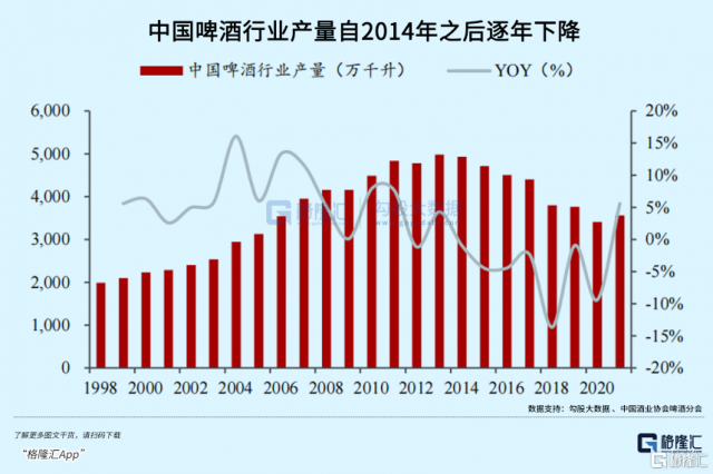 转折发生在2014年。2013年中国啤酒产量为5061.5万千升,2014年下降至4922万千升,首次出现产销量下滑。此后,中国啤酒产量进入快速下降通道,到2020年产量进一步下降至3411.1万千升,2021年虽然回升至3562.4万千升,但随着我国金融老龄化时代,20-50岁的主流消费人群确定性减少,啤酒产销量的下行趋势,已难以改变。