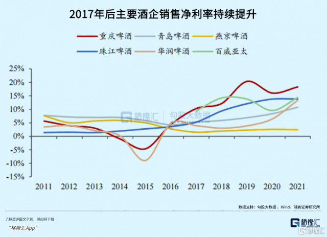 也就是2013年啤酒行业销量见顶之后的数年,经历过数轮大洗牌,行业格局逐渐确定下来之后,中国的几大国产啤酒品牌才加速了高端化的打法,也逐渐由此享受到了虽然不怎么增收,但利润率得以大幅回升的红利。