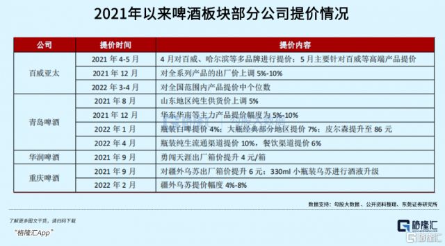 除了注入嘉士伯品牌本身就以走精酿路线为主的重庆啤酒外,青岛啤酒很早就划分了高档(一世传奇、青岛啤酒原浆、琥珀拉格、黑啤、奥古特、皮尔森、IPA、纯生),中档(青岛经典、白啤)和大众低档的崂山品牌等产品分层;原来主打大众消费的华润雪花啤酒2019年引入喜力旗下的喜力、红爵、苏尔、悠世白啤酒国际品牌,也推出了高端化战略;燕京啤酒也创立了“狮王精酿”独立高端品牌,并不断推出新品如“鲜啤2022”、U8plus 及高端拉格Super12 皮尔森等。