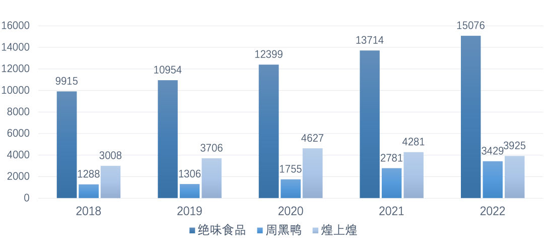 截至2022年末,绝味食品在中国大陆地区的门店总数达到15076家,周黑鸭的门店数为3429家。三巨头中,仅煌上煌在疫情下连续两年收缩,最新门店数为3925家。