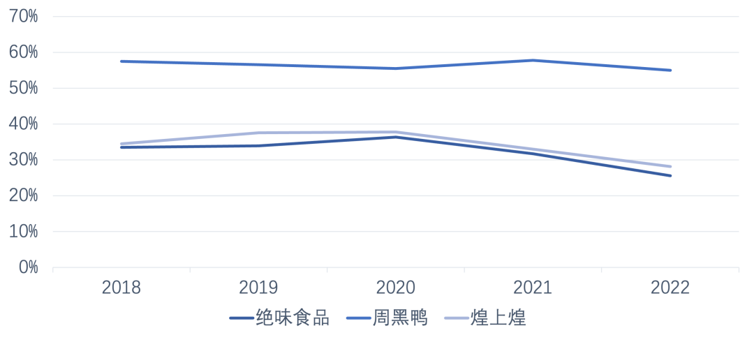 在2016年上市之初,周黑鸭凭借高端化的形象提升估值,毛利率也一直保持在50%以上。相较之下,绝味与煌上煌的毛利率仅34%左右。