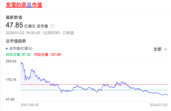 然而,截至1月22日港股收盘,奈雪的茶市值为47.85亿港币,不到IPO时的两成。