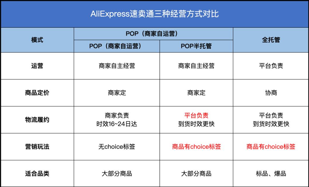 据速卖通介绍,目前平台有三种经营模式,分别为“POP”、“POP半托管”和“全托管”。