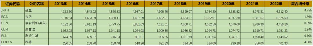 其一是“增长困境”。我们统计了横跨个护、美妆行业的6家公司(以市值排序为:强生、宝洁、联合利华、高露洁、科蒂)过去10年的营收,发现它们已集体陷入增长困境:十年CAGR(年复合增长率)最高的也就6.1%,中位数为2.04%