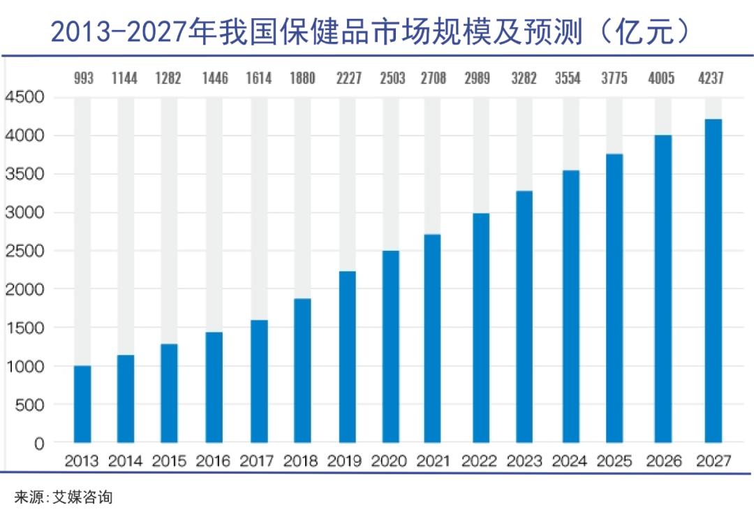 根据艾媒咨询的数据显示,我国保健品市场规模在2013年还不足千亿,十年之间已经上升到超过3000亿,预测在2027年,可以超过4000亿。