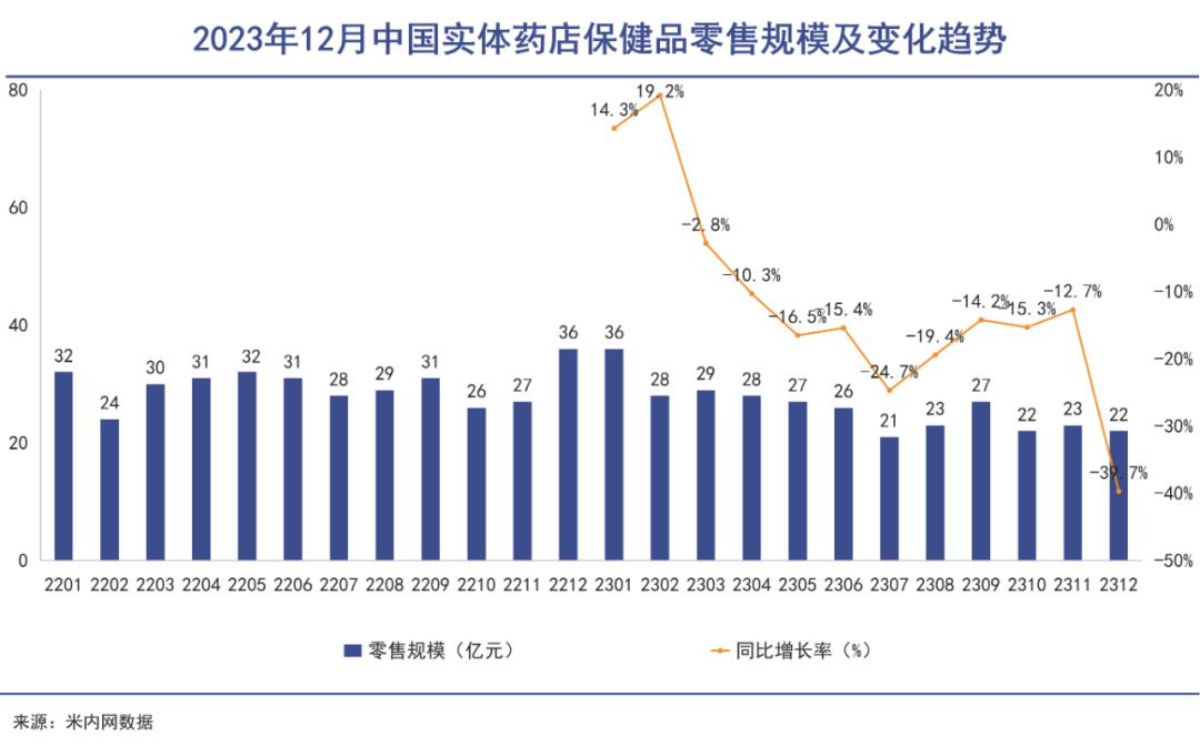 从汤臣倍健深耕的药店渠道来看,根据米内网数据显示,2023年12月中国实体药店保健品零售规模为22亿元,同比下降39.7%。2023年全年保健品市场销售规模为313亿元,降幅达12.3%。