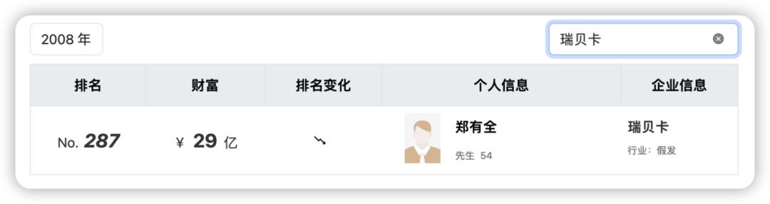 凭借着品类丰富和价格优势,瑞贝卡迅速挤掉日韩企业,成为假发行业的新王者。2008年胡润富豪榜上,郑有全以29亿身家一度成为河南首富。