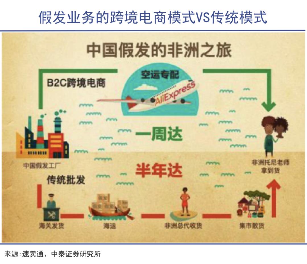 相比线下渠道,线上品类丰富、价格透明、购物流程更简单。传统多级分销模式下,一顶假发从国内送到非洲客户手中,往往需要数月时间,但如果通过速卖通/菜鸟的跨境专线,仅需不到一周。