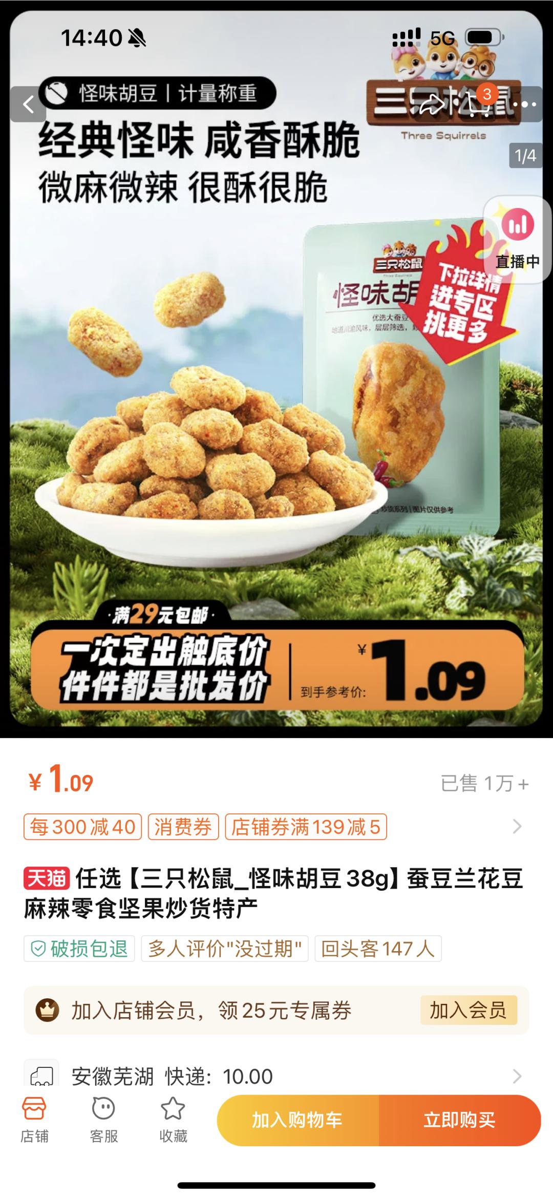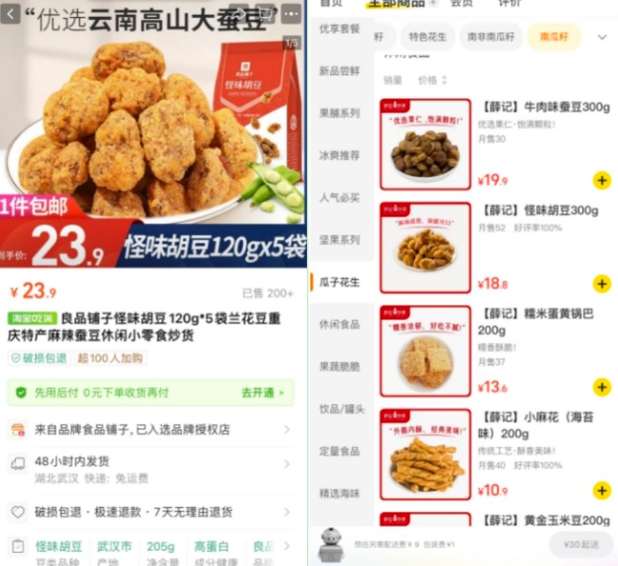 以怪味豆为例,薛记炒货在美团上300g的价格是18.8元,良品铺子天猫旗舰店里的600g(120gX5包)价格为23.9元,三只松鼠天猫旗舰店38g价格为1.09元,计算下来,380g的价格也不过10.9元。
