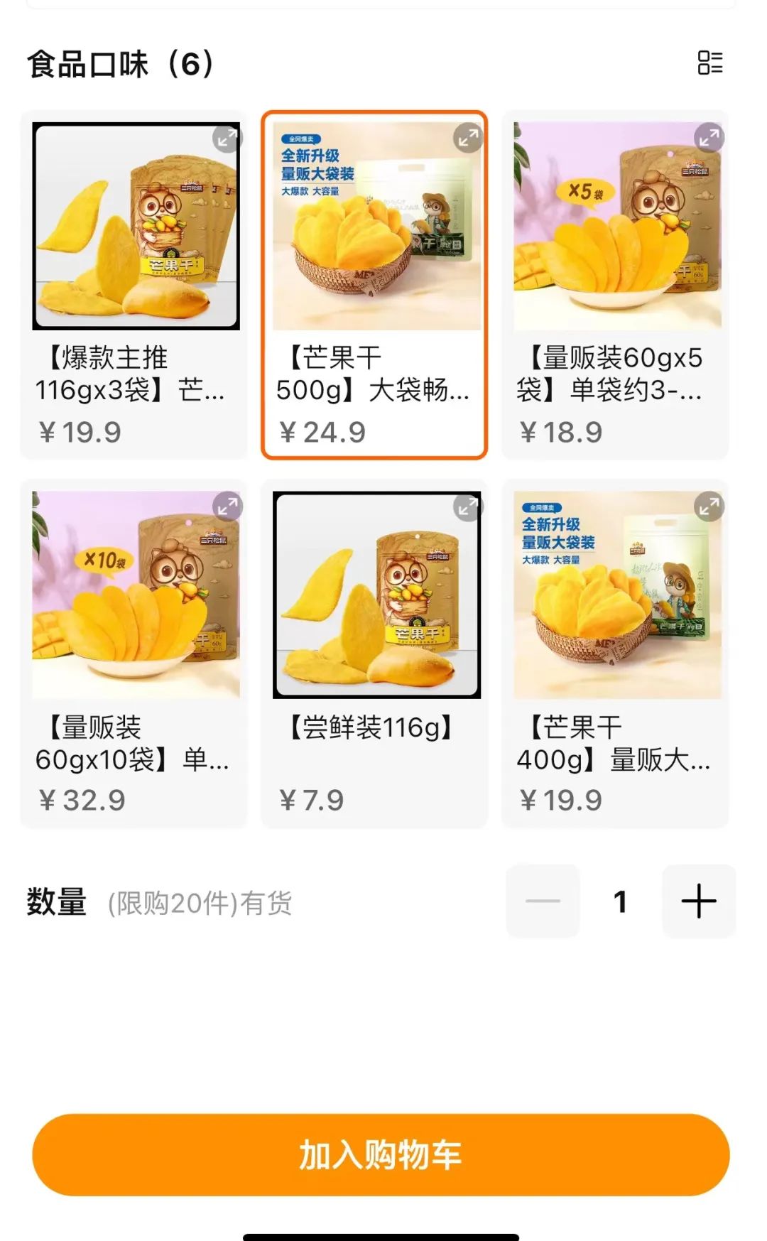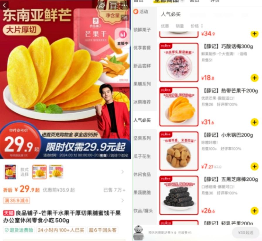 再比如芒果干,薛记炒货的芒果干200g售价31.6元,良品铺子500g的价格为29.9元,三只松鼠500g的价格24.9元。