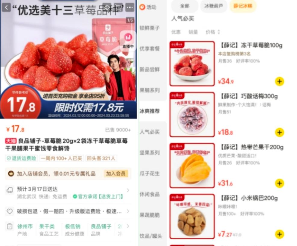 当然,这只是一部分 SKU 的现状,在其它品,如草莓脆的价格上,在同等克重下,薛记炒货是略低于良品铺子的。