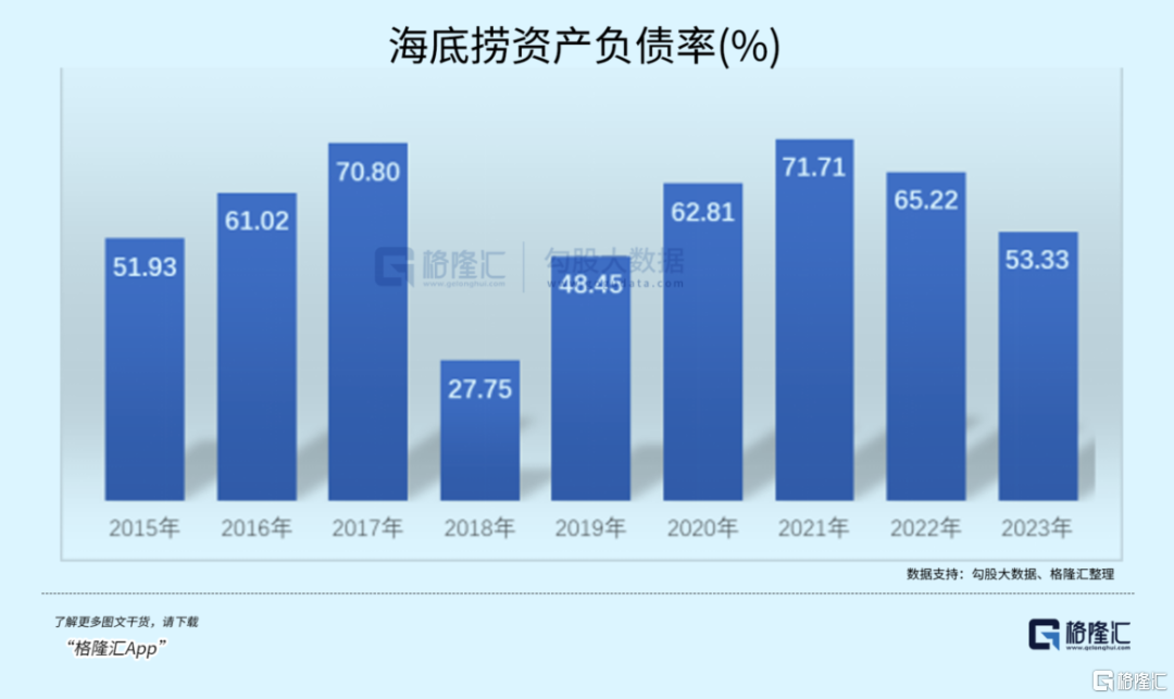 大幅扩张之后,海底捞在2020年出现了超过8亿元的资金缺口。资产负债率也开始持续走高,从上市时的27.75%,一路上升至2021的71.71%。