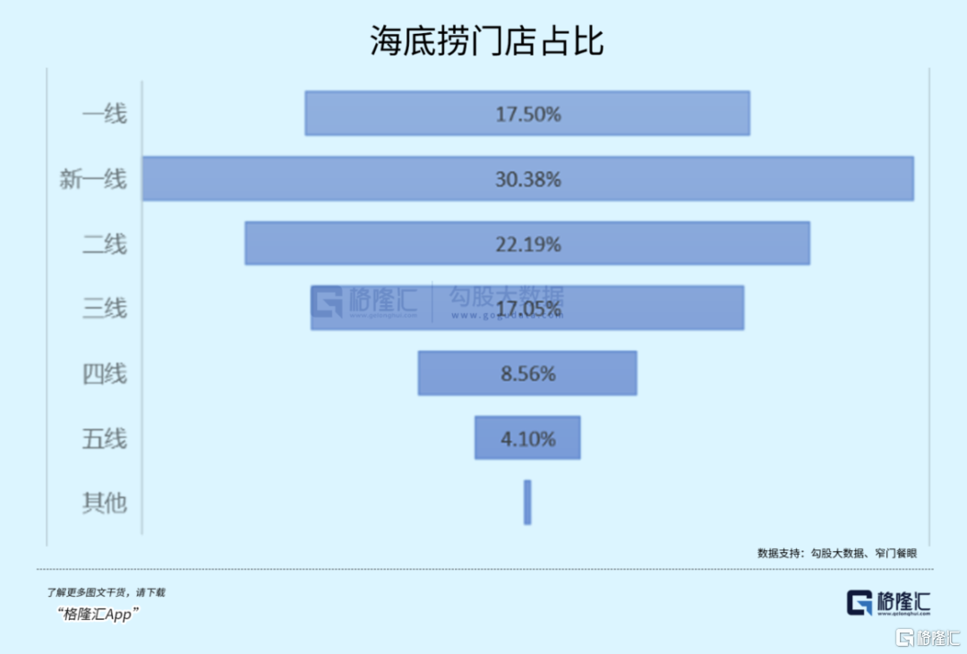 而在二线城市以下,城市线级越低,海底捞的门店越少,呈明显的倒三角型。