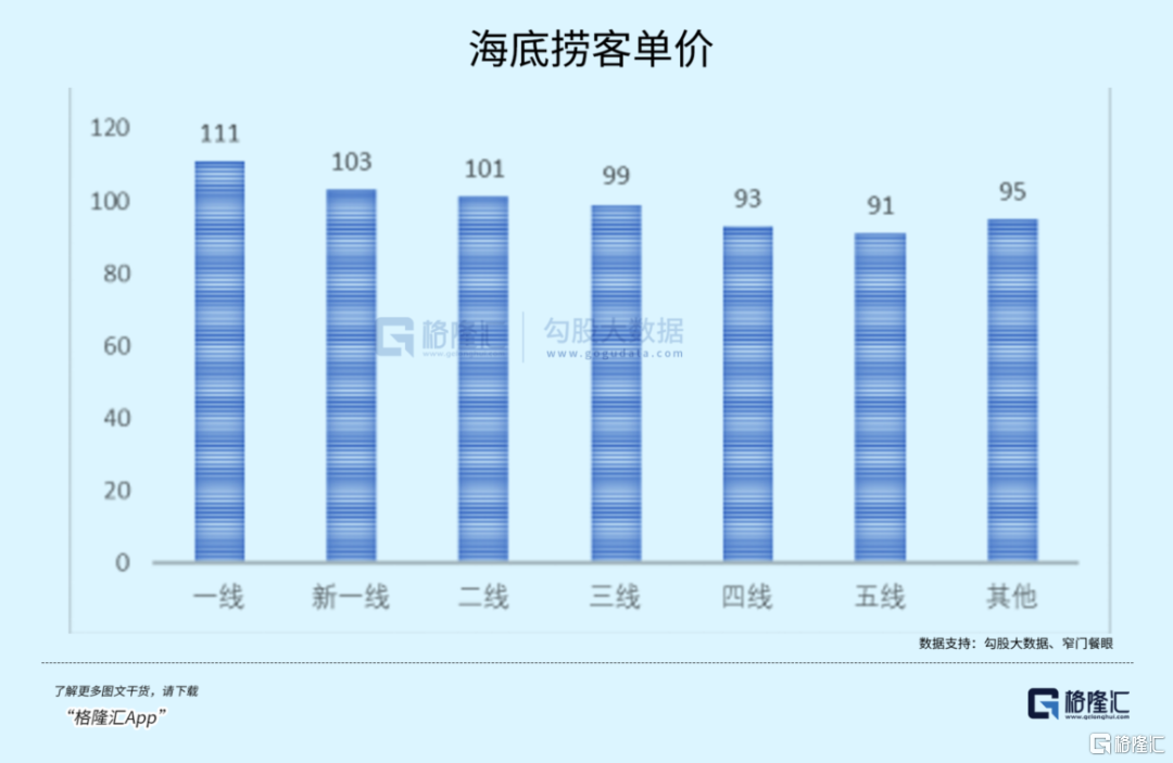 海底捞在一线城市的客单价为111元,四线、五线城市的客单价为93、91元,相差近20元。