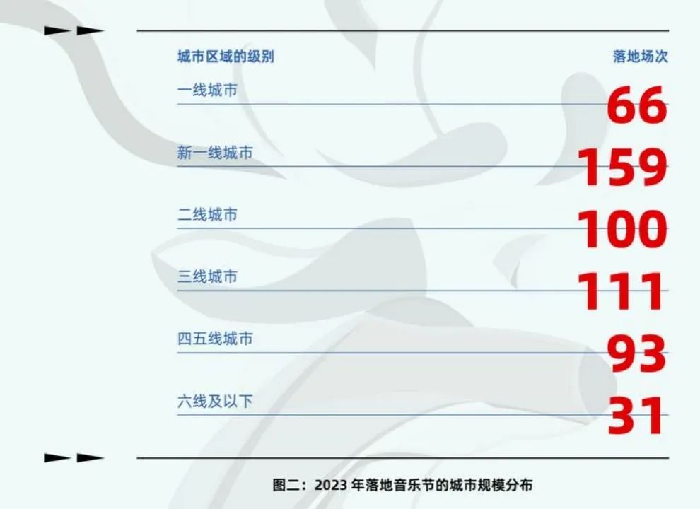 近年来,音乐节的地域范围不再局限于一二线城市,而是逐渐覆盖三、四线城市甚至是县城。《2020-2024年中国音乐节市场发展研究报告》显示,在2023年举办的560场音乐节中,在一线及新一线城市举办的占比约四成,其余六成均是在二线及以下城市举办的。