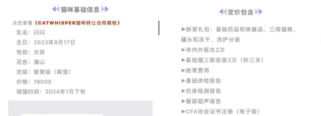 在喂养方面,种猫公猫以生骨肉为主,辅以自制猫饭、罐头、冻干。母猫以猫粮、冻干、自制猫饭并线喂养,罐头以进口德罐和新西兰罐为主。在交易过程中会标注各种细节展示、定价包含服务以及家族基础信息。