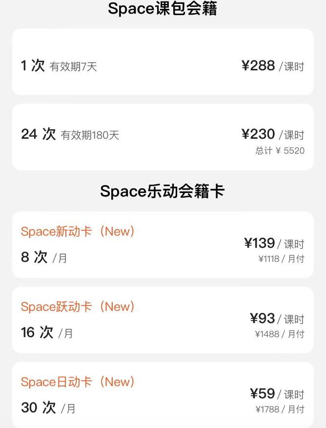 据悉,Space单次课包定价为288元,只有购买月卡或年卡,课程单价才能下降。但是要想上到59元/节的价格,一个月需要上满30节课,很难消耗完。
