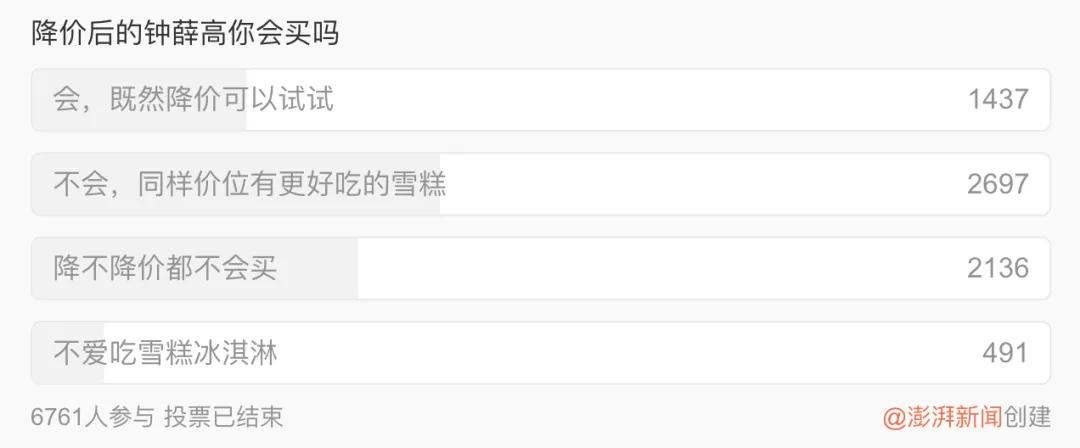 澎湃新闻曾发起一项“降价后的钟薛高你会买吗”的调查,结果有超过70%的人表示不会。