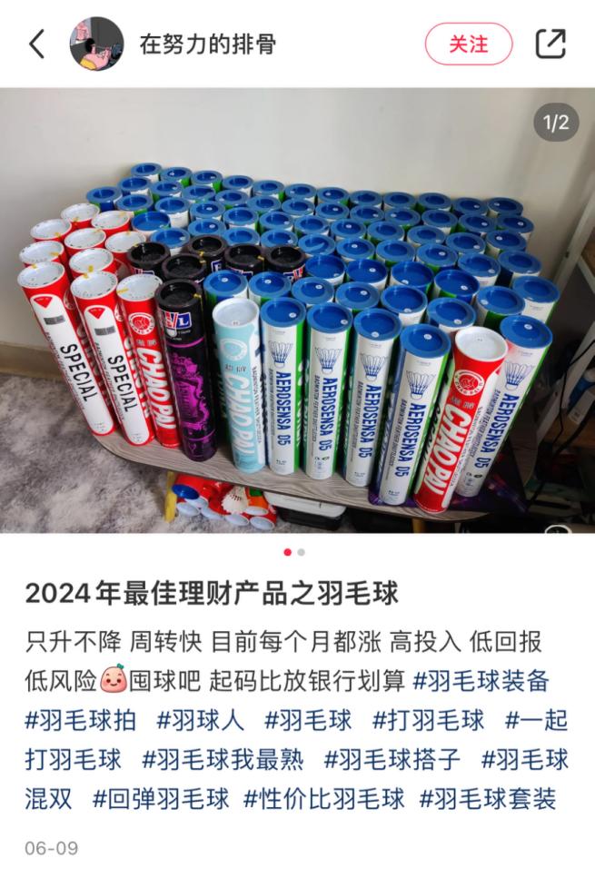 小红书上感慨羽毛球涨价太快的消息不在少数,不少人调侃短时间内的三级跳让羽毛球跃升为新晋理财产品。小红书用户“在努力的排骨”发文称,“羽毛球为2024年最佳理财产品,只升不降,周转快,每个月都涨,低回报、低风险。”