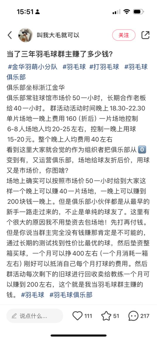 小红书用户“叫我大毛就可以”算了一笔账,做羽毛球群主3年赚了多少钱,文中也提到了旧球回收的事,按每月消耗一箱球来算,折旧转手给教练一箱球能卖出约200元左右的价格。
