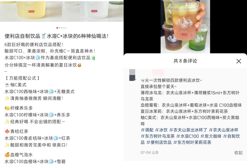在小红书上关于冰杯体验的帖子中,有不少是关于茶饮店饮品平替的,“薄荷冰乌龙=农夫山泉冰杯+薄荷糖浆15ml+东方树叶乌龙茶;血橙葡萄=农夫山泉冰杯+葡萄冰球+水溶C100血橙味……”冰杯作为“特调”的基础,喝一样的水,花更少的钱,无疑戳中了这一代年轻人的G点。