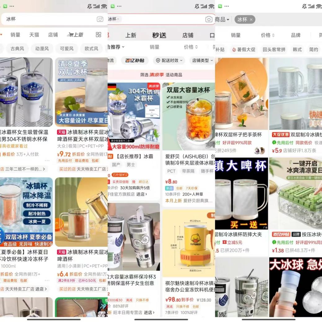 在常用的电商平台搜索“冰杯”,搜索结果几乎只有各种“创意杯”、“保冷杯”这种纯杯子,因此冰杯几乎远离了物流时间在几天左右的异地配送,而主要是即时零售,特别是只有线下,才有更加具体可触性更强的消费场景。