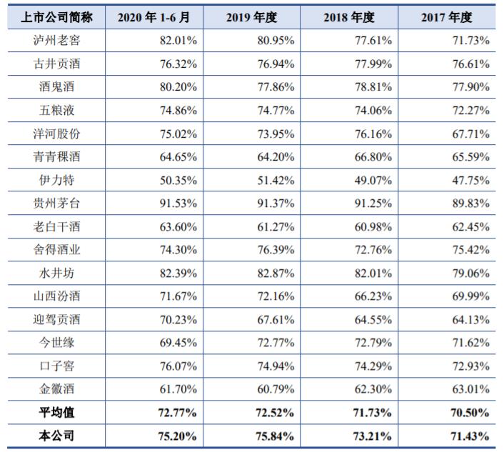 业绩方面,2017年至2020年1-6月,国台酒业的营业收入约5.73亿元、11.76亿元、18.88亿元、13.59亿元,对应的净利润分别约0.47亿元、2.4亿元、4.1亿元、2.45亿元,同期主营业务毛利率分别为71.43%、73.21%、75.84%、75.20%。