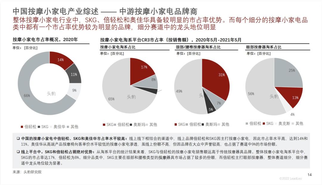 2022年,头豹研究院发布的《中国按摩小家电行业》报告显示,线上线下相结合的渠道中,倍轻松和SKG的市占率分别达到14%和11%。这两大头部品牌的增长,主要来源于线上渠道的快速发展。
