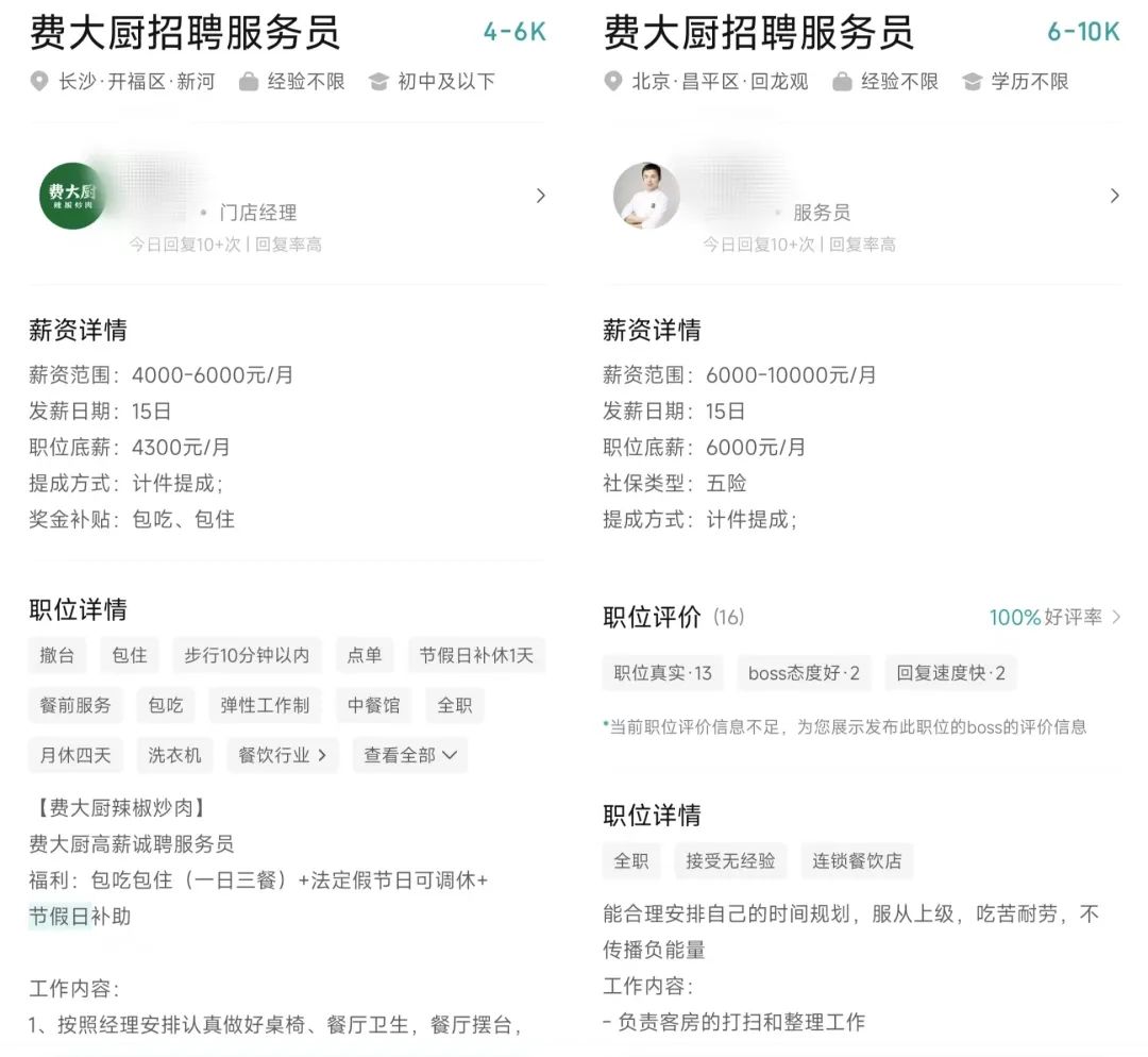 惊蛰研究所在Boss直聘上搜索发现,餐饮品牌费大厨在北京招聘服务员给出的薪资待遇是6000元-1万元,同时缴纳五险。而给长沙相同服务员岗位开出的薪资待遇为4000元-6000元,并且未注明是否缴纳社保。
