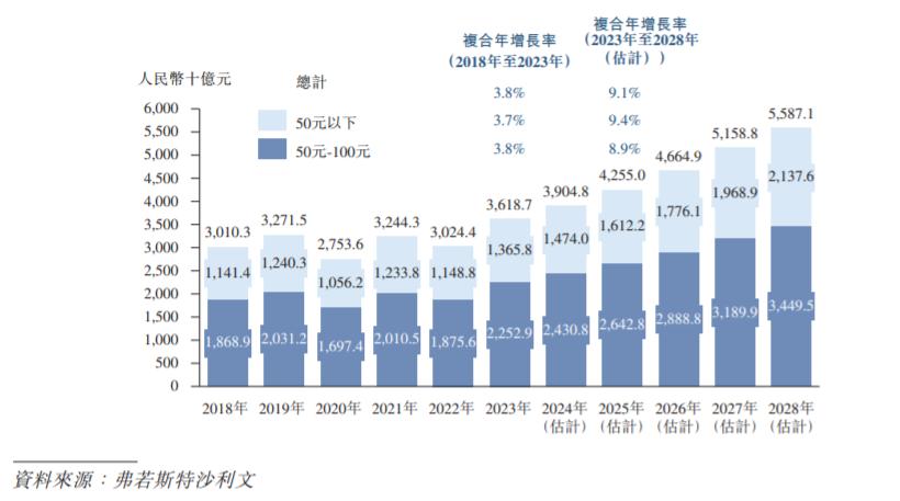 据弗若斯特沙利文的资料,按收入来算,2023年客单价50元至100元的细分市场规模已超过2.25万亿,约占整体中式餐饮市场的55.2%,预计2023年至2028年将以8.9%的复合年增长率增长。