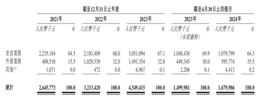 具体来看,小菜园的收入主要来自堂食业务、外卖业务。2021年至2024年1-4月,堂食业务的营收占比从84.5%下滑至64.3%,外卖业务的营收占比有所提高。