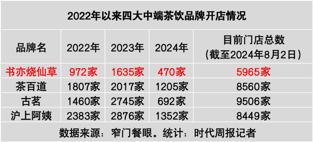 根据窄门餐眼,2022年、2023年、2024年至今,书亦烧仙草新开门店数量分别为972家、1635家与470家,同一时期,茶百道、古茗与沪上阿姨的新开门店数量均远超书亦烧仙草。其不足6000家的门店体量相当于倒退到了2年前。