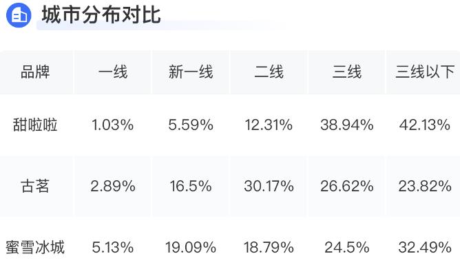 甜啦啦还有一个特点是,选址的下沉。从创立品牌一开始,王伟就将甜啦啦定位在下沉市场,且从数据看出,其将门店开在比蜜雪还要下沉的地方。