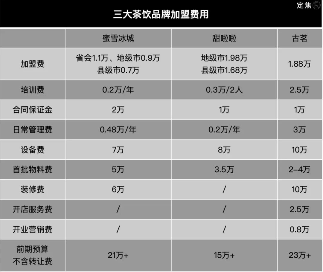 有加盟商告诉「定焦One」,甜啦啦今年开启了免加盟费的活动,但是首批进货物料费实际进了8万多元,装修花了近10万,加上收银机、电视机、工作服等费用,价格远超15万。他有朋友加盟了蜜雪冰城,加上租金和转让费,各项开支加起来落地价也需要40万左右。