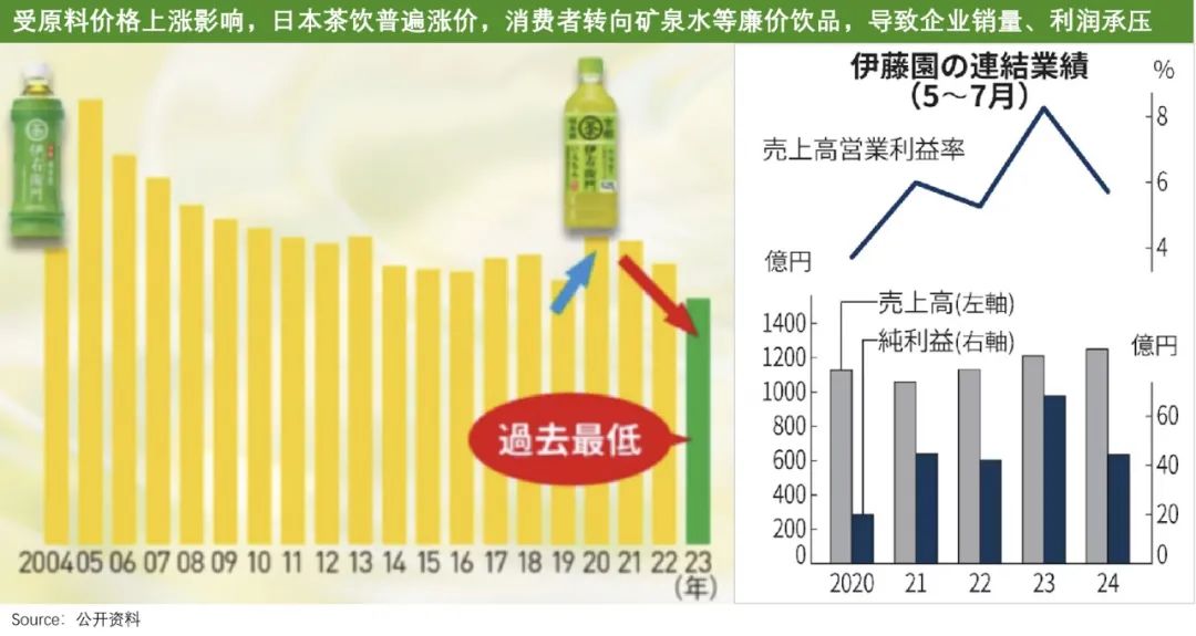 三得利的明星品牌“伊右卫门”,去年在日本的销量创下历史新低,一度被担心会下架;今年伊藤园也顶不住了,扬言要考虑“调整2025年经营目标”。