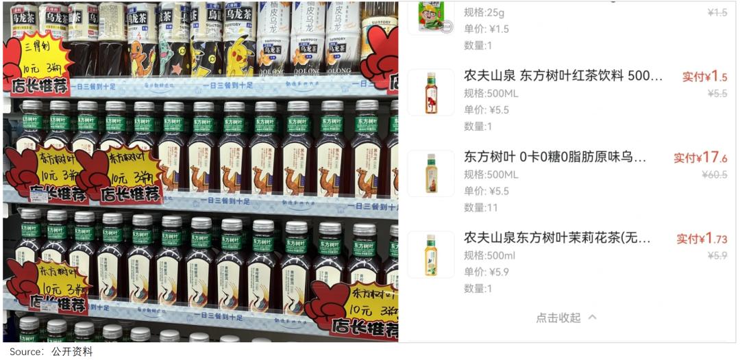 甚至31.1元可以搞定18瓶三得利;500ml装东方树叶在即时零售平台上,也能一块多拿到,比矿泉水还实惠。
