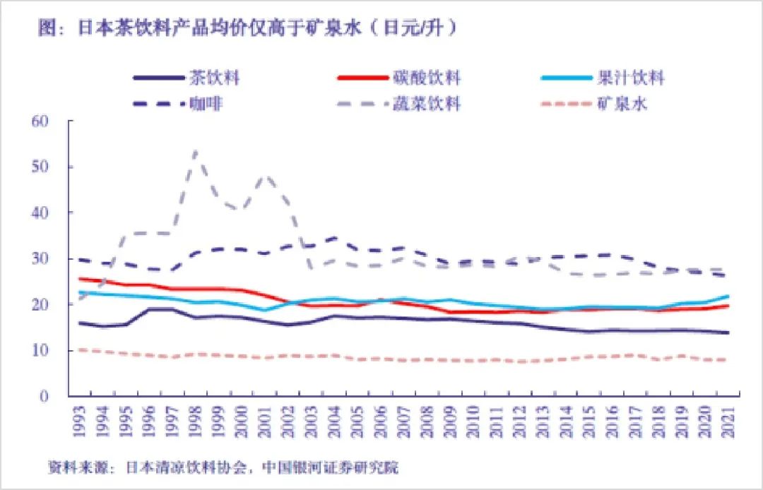1990年代,日本的无糖茶饮品每升单价仅为15日元,是可乐价格的60%、果汁的65%,只比矿泉水略贵。