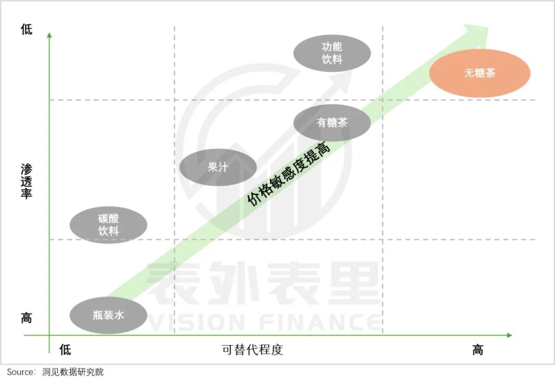 之所以如此“心口不一”,在于对国内无糖茶玩家而言,降价只是顺势而为——畅销饮品中,无糖茶基于可替代产品多、渗透率低,对价格的敏感度是最高的,降价可以更快打开市场。